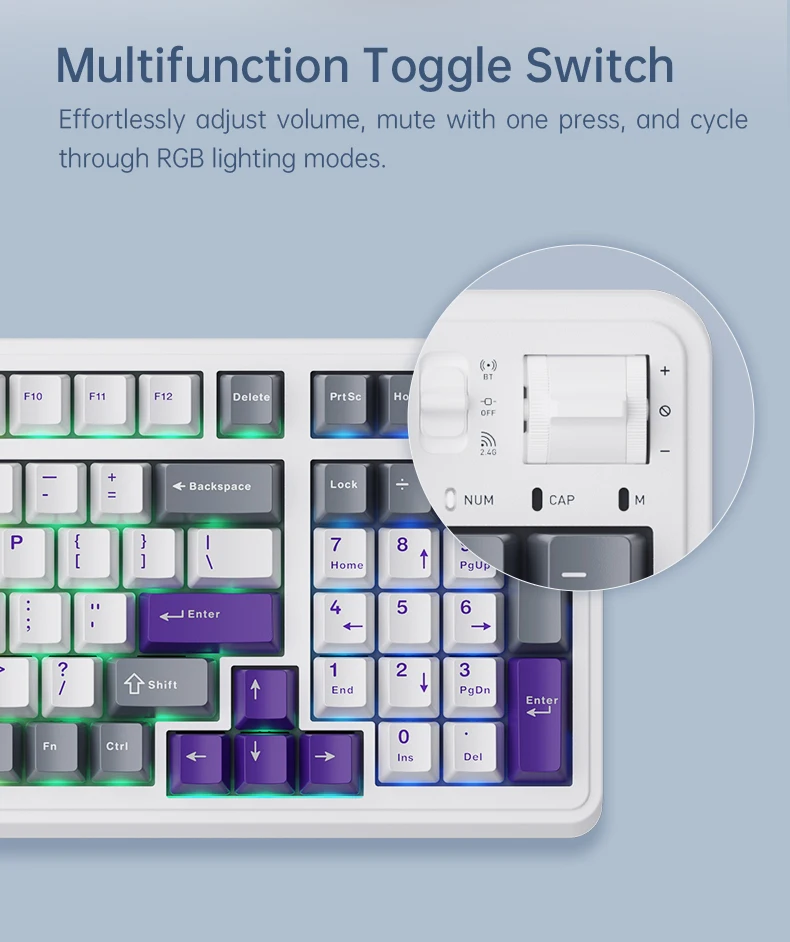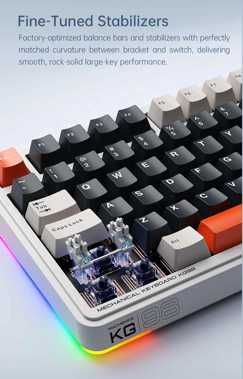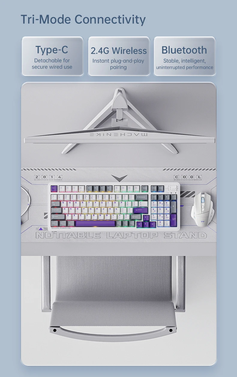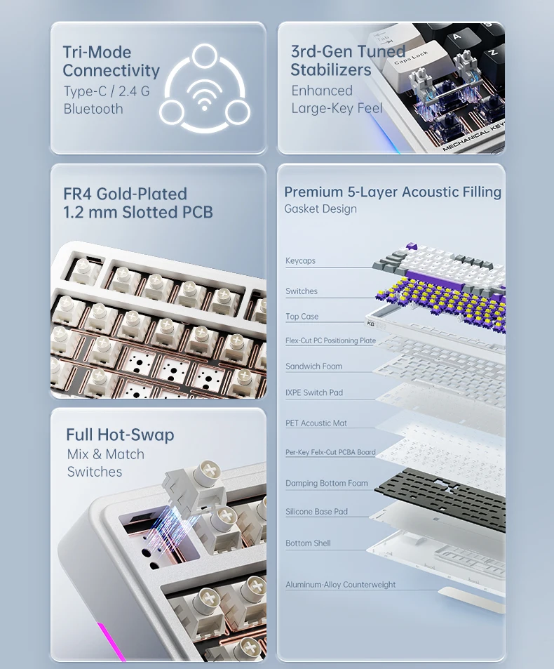 Connection : Supports Type-C, 2.4G wireless, and Bluetooth tri-mode connection. Equipped with 3rd-gen tuned stabilizers, ensuring smooth and stable performance for large keys.
