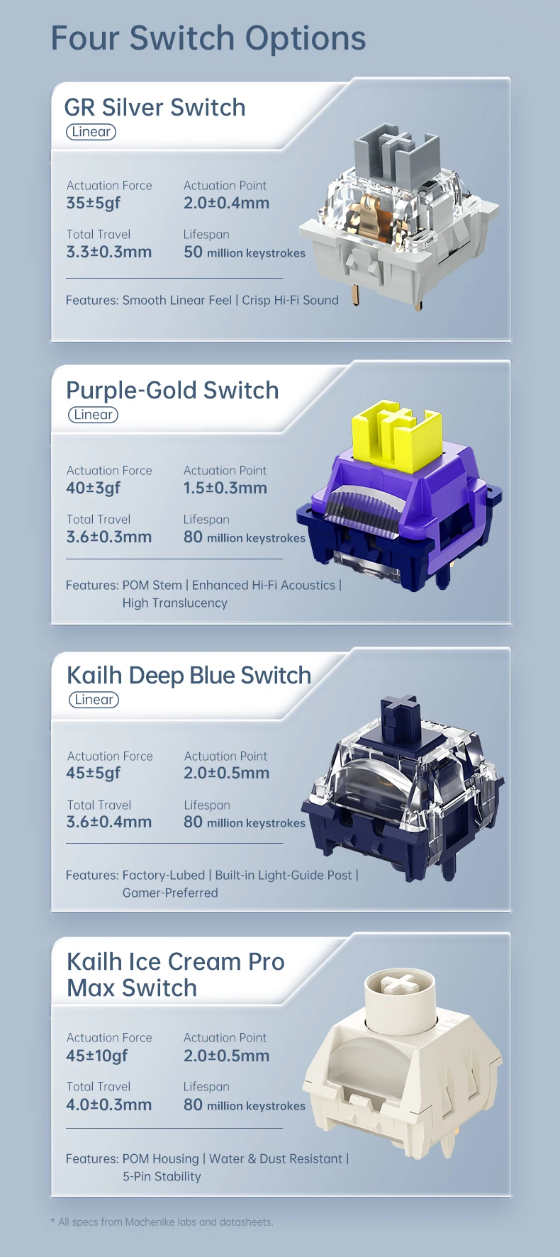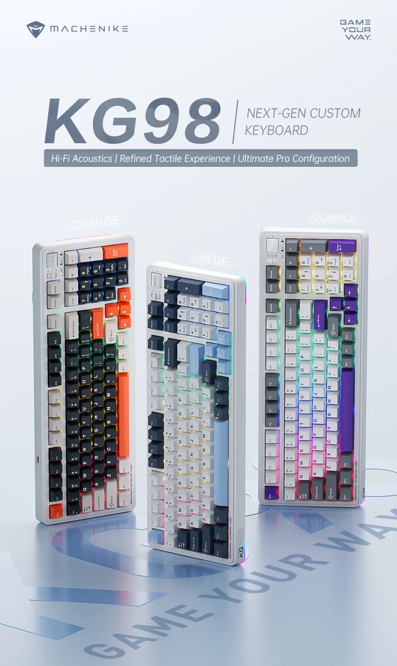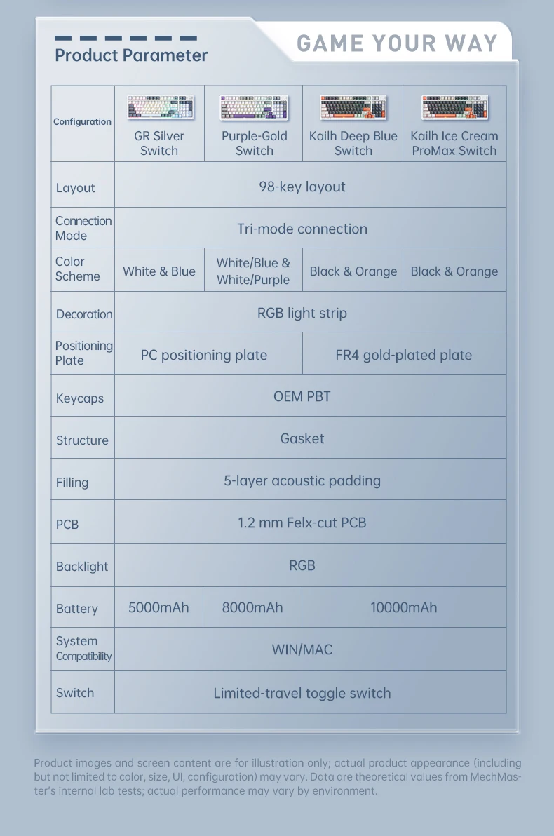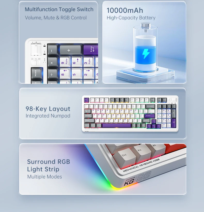 Hot-swappable & Switches: Supports full-key hot-swapping. Available with GR Silver Switch, Purple-Gold Switch, Kailh Deep Blue Switch, and Kailh Ice Cream Switch, meeting different typing and gaming needs.