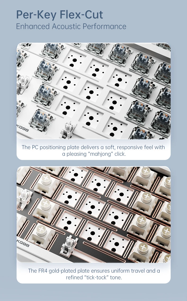 Acoustics & Structure: Adopts premium 5-layer acoustic filling gasket structure, paired with FR4 gold-plated slotted PCB. Delivers excellent acoustic performance, with soft and responsive key feel.